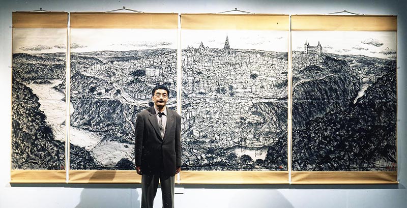 「トレド 」 墨画 212×472cm 軸装の前にて |